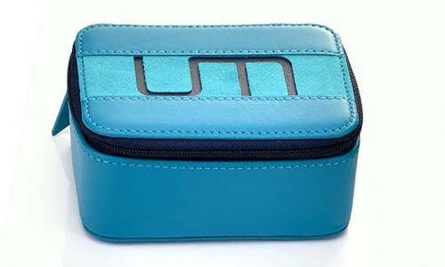 付属のレザーケースは、Unique Melodyのブルーを基調にしたブランドカラーを採用。本体には厚さ1.3~1.5mmの上質なレザーを採用し、優れた耐久性と気品ある光沢を備えています。中央のフラップ部分にはインド産の羊革を使用し、柔らかなベルベット調の質感に仕上げました。